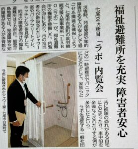 1月30日の北國新聞、中日新聞にLABOの福祉避難所が取り上げられました。また、協働で準備したAARさんのHPにも掲載されました。 この福祉避難所は、能登半島地震を体験し、障害がある方の福祉避難所の少なさを実感したため、 […]